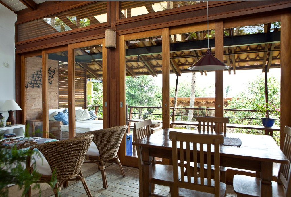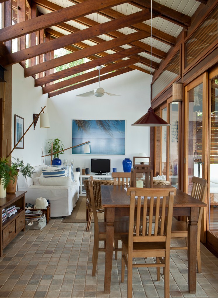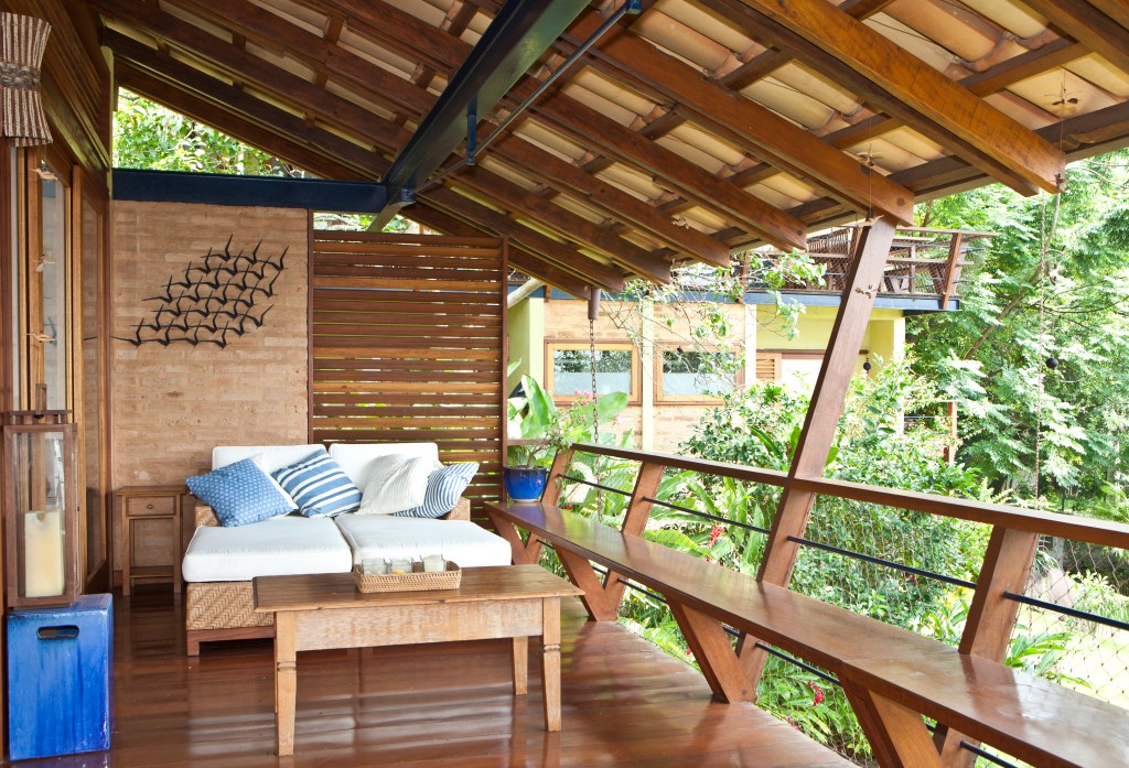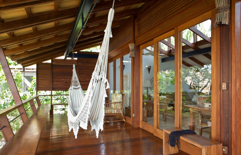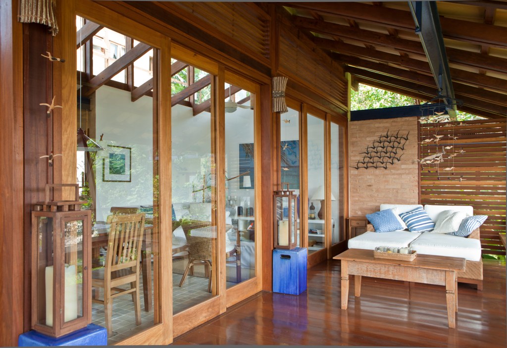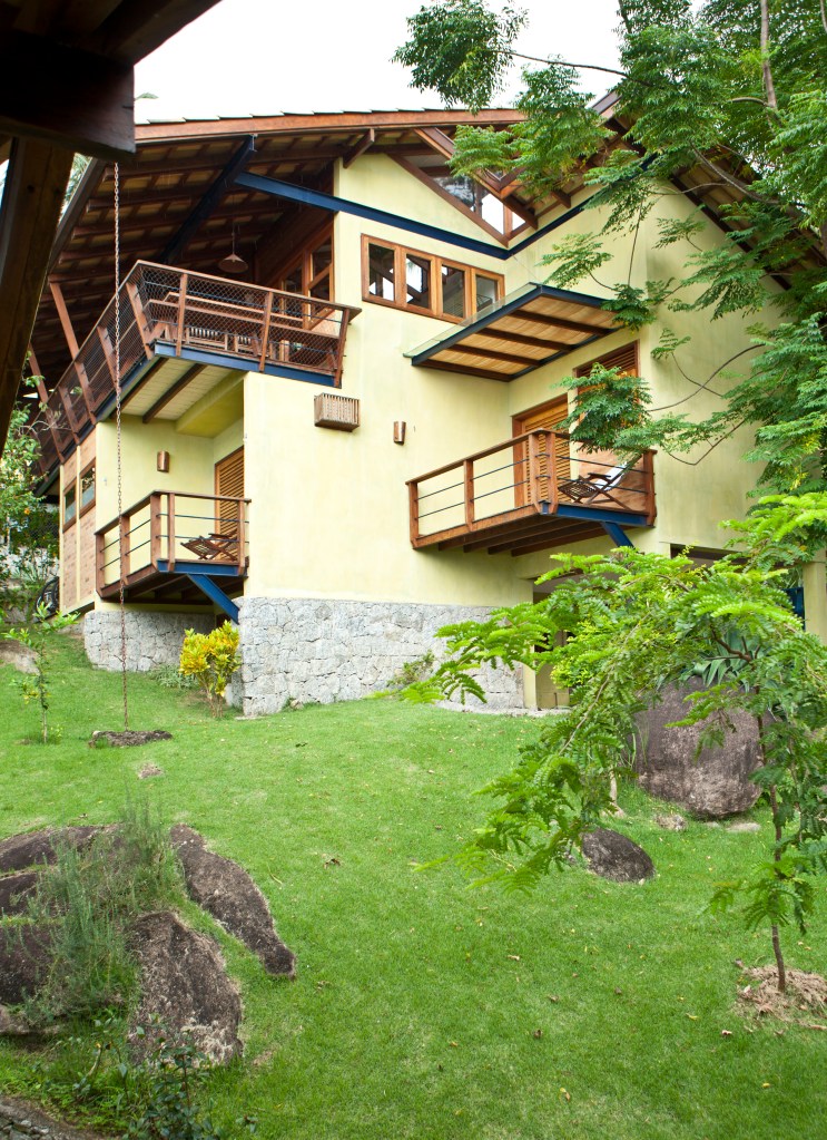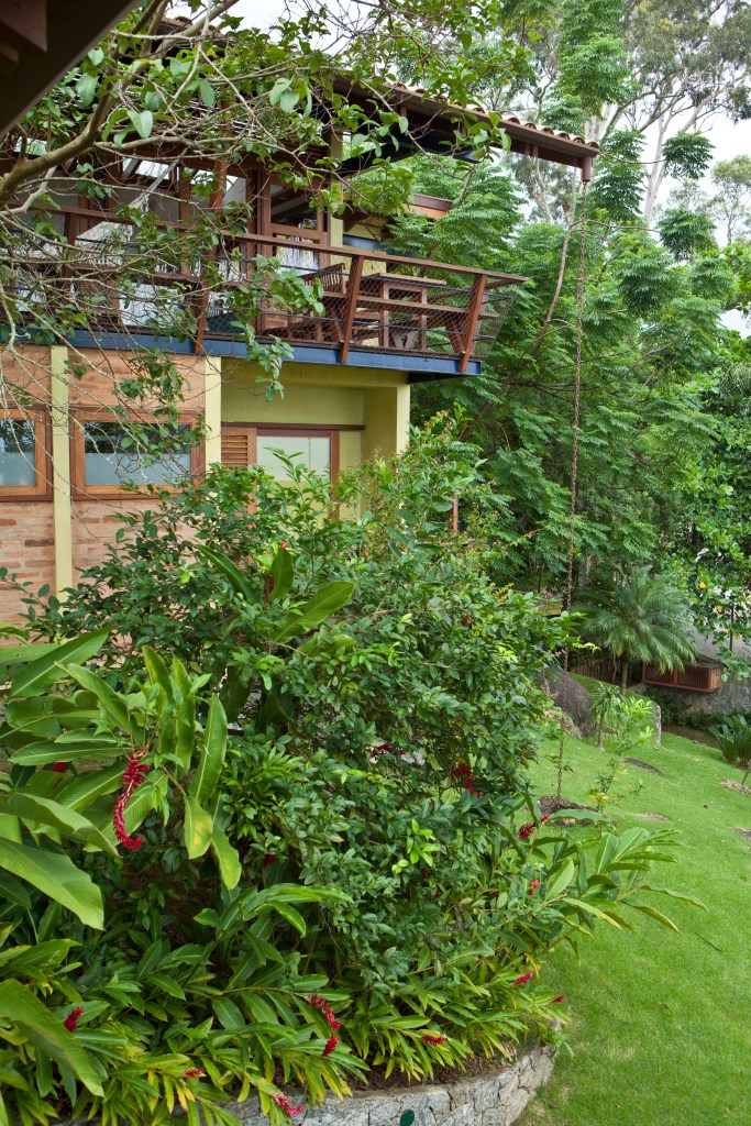 Em meio à vegetação exuberante de Ilhabela-SP, três residências rústicas se integram à natureza com telhado aparente, vigas de madeira e amplas esquadrias que garantem iluminação e ventilação cruzada. A escada metálica azul, com degraus de madeira, adiciona leveza ao design, enquanto a varanda convida à contemplação com um peitoril que se transforma em banco. Materiais resistentes ao clima litorâneo reforçam a durabilidade e o charme do projeto, criando um refúgio perfeito de harmonia entre arquitetura e natureza.