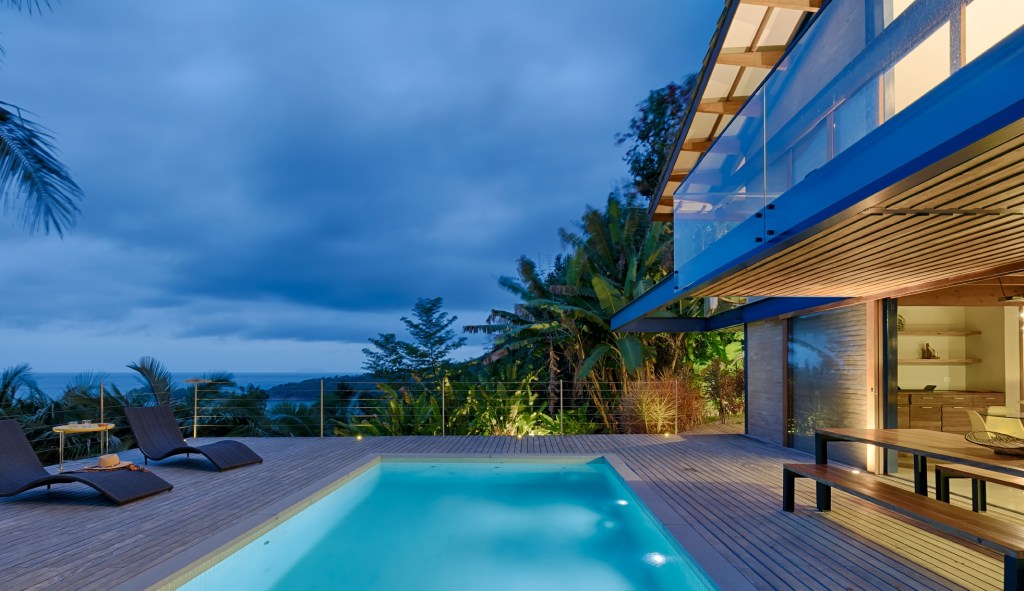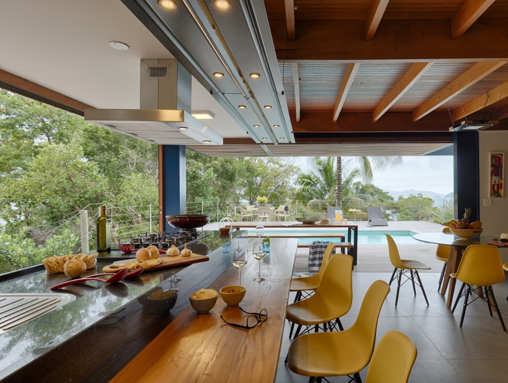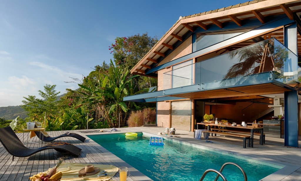 Esta casa de praia combina modernidade e tranquilidade em perfeita harmonia com o ambiente costeiro. Sua estrutura metálica azul e telhado aparente conferem um design sofisticado e contemporâneo. A piscina, cercada por um amplo deck, convida ao relaxamento, enquanto a varanda superior, com guarda-corpo de vidro, proporciona uma vista panorâmica do mar. Grandes vãos de vidro integram os espaços internos à paisagem, tornando esta casa um refúgio ideal para quem busca conforto e conexão com a natureza.