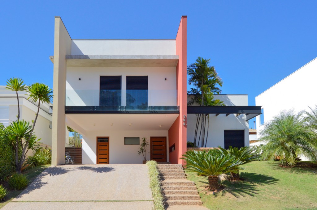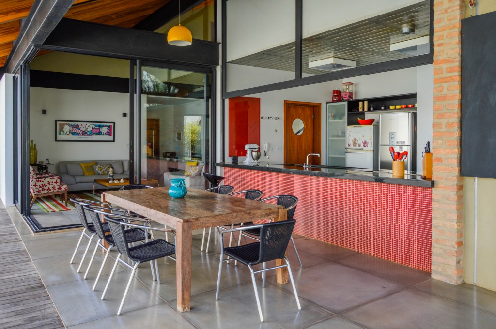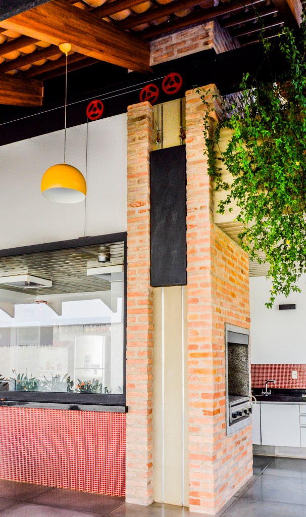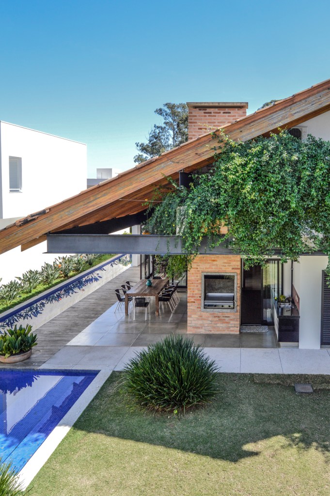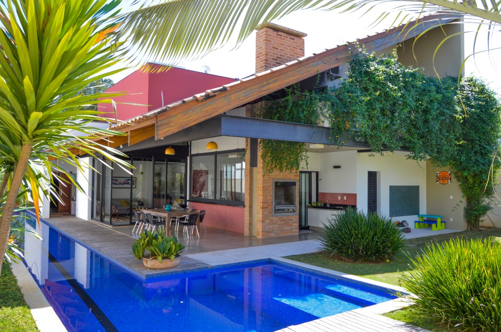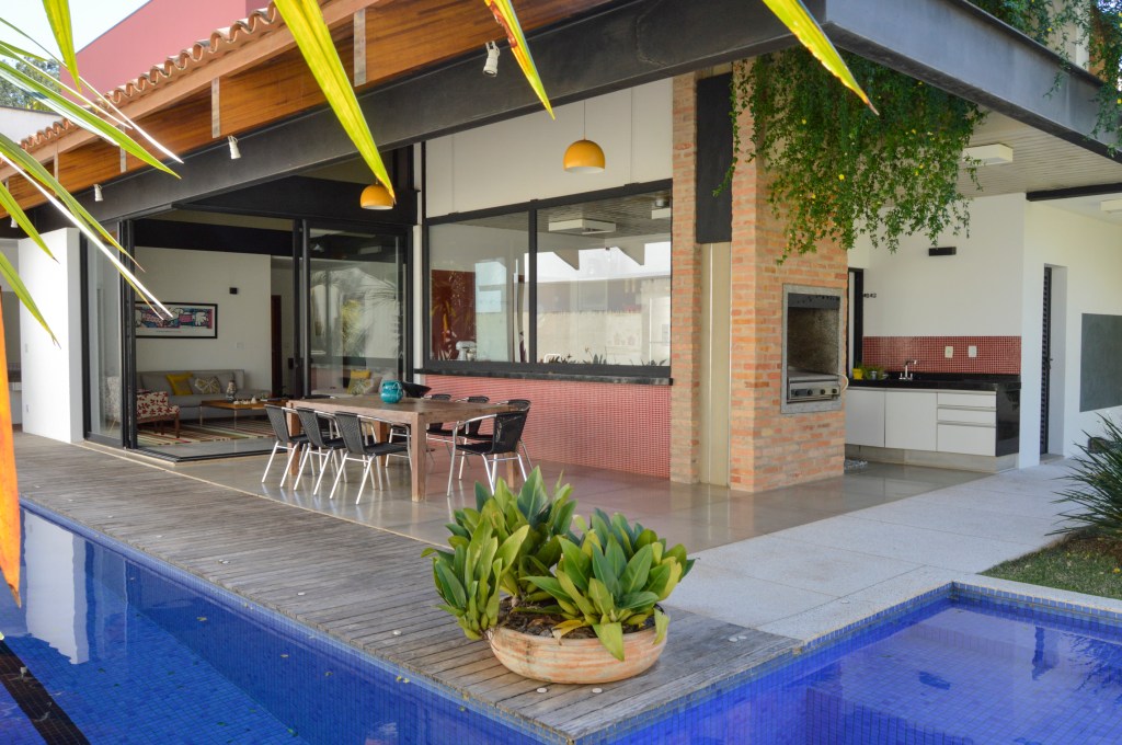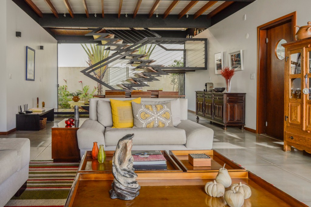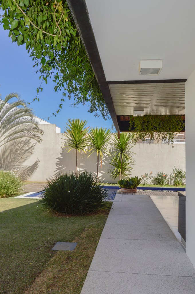 Esta residência contemporânea se destaca pela integração entre interior e exterior, com linhas retas, telhado embutido e painéis de vidro que conectam os espaços ao jardim tropical. Na área social, um telhado de uma água só, com vigas robustas de madeira laminada colada, adiciona aconchego e proteção solar. A sala combina móveis clássicos com elementos modernos, como a escada geométrica em metal e madeira. A cozinha se abre para a varanda por meio de um painel de vidro com sistema de contrapeso. Já o home theater conta com uma janela baixa em fita, permitindo visão para a piscina e paisagismo, unindo funcionalidade e sofisticação.
