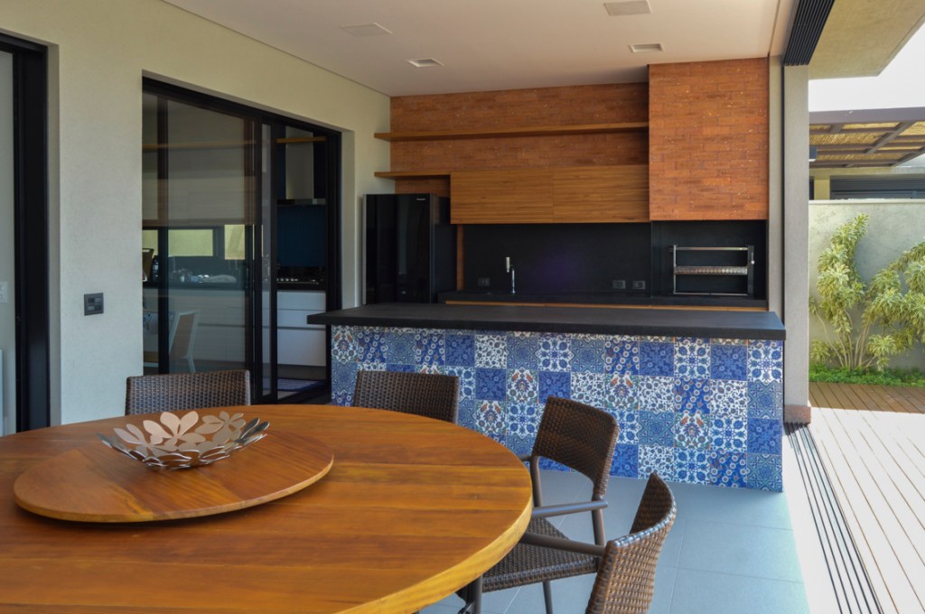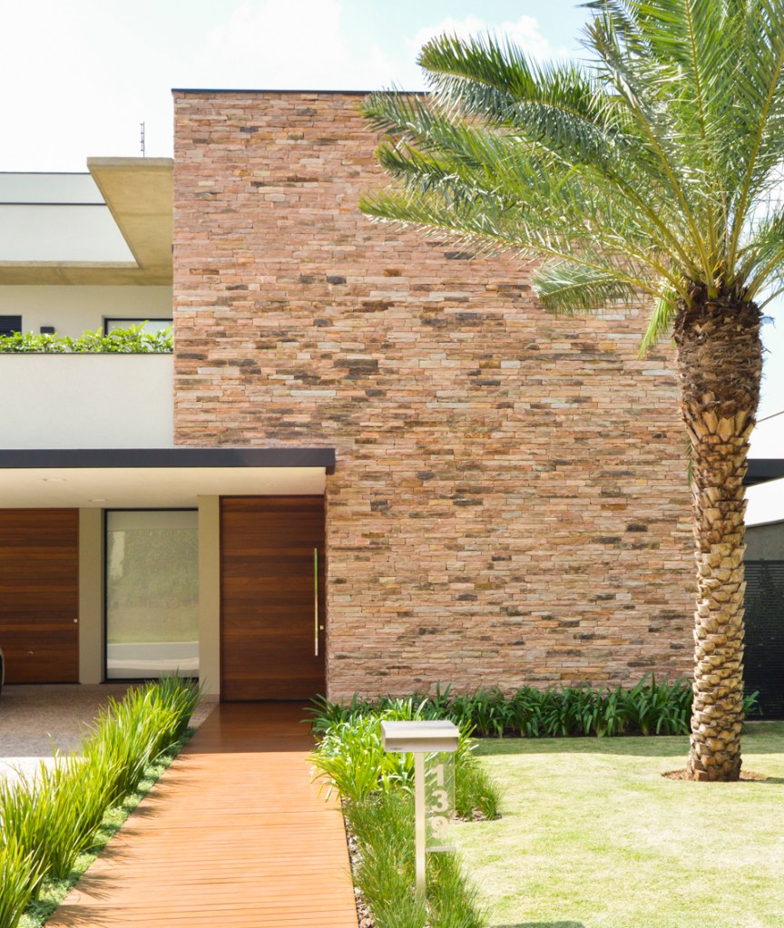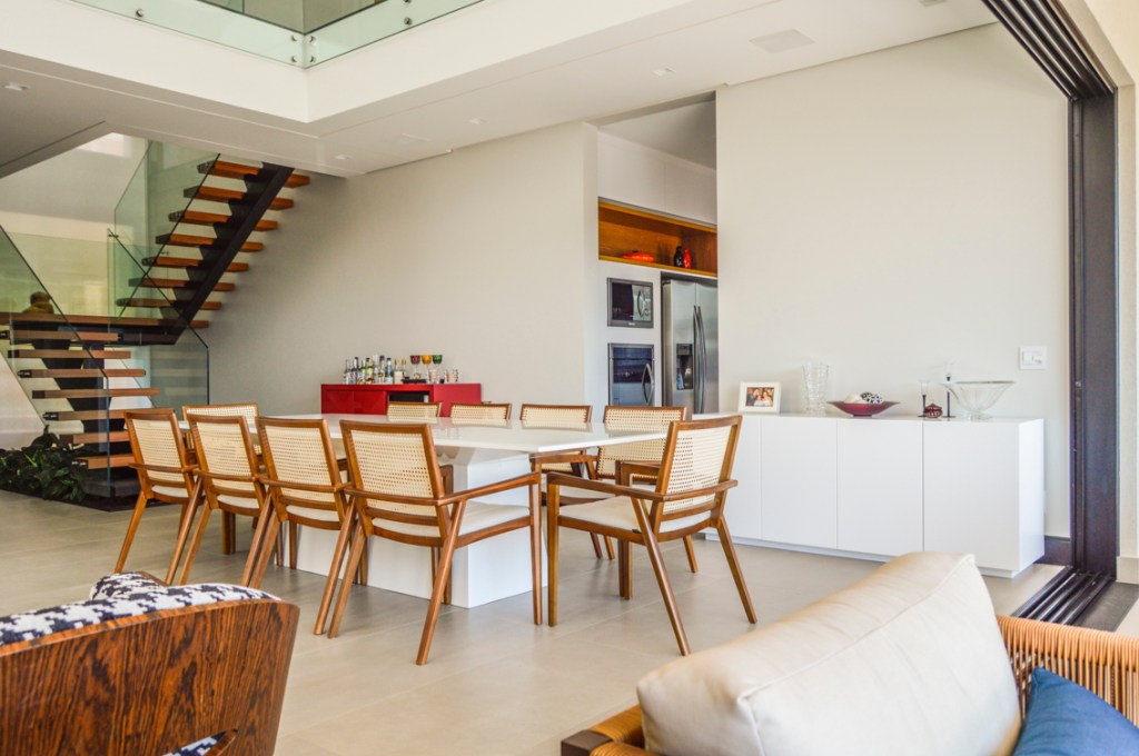 A Casa Elementos combina linhas retas e materiais naturais em um design atemporal. A fachada é marcada por filetes de pedra madeira, contrastando com tons de branco e preto para um visual sofisticado. O acesso se dá por um caminho de madeira cercado por paisagismo discreto, levando a uma porta maciça acolhedora. No interior, a escada metálica com degraus de madeira e peitoril de vidro adiciona leveza, enquanto um jardim interno reforça a conexão com a natureza. O escritório, integrado ao mezanino por um painel de vidro, equilibra privacidade e estética. A área gourmet se abre totalmente para a piscina, proporcionando integração e fluidez entre os espaços.