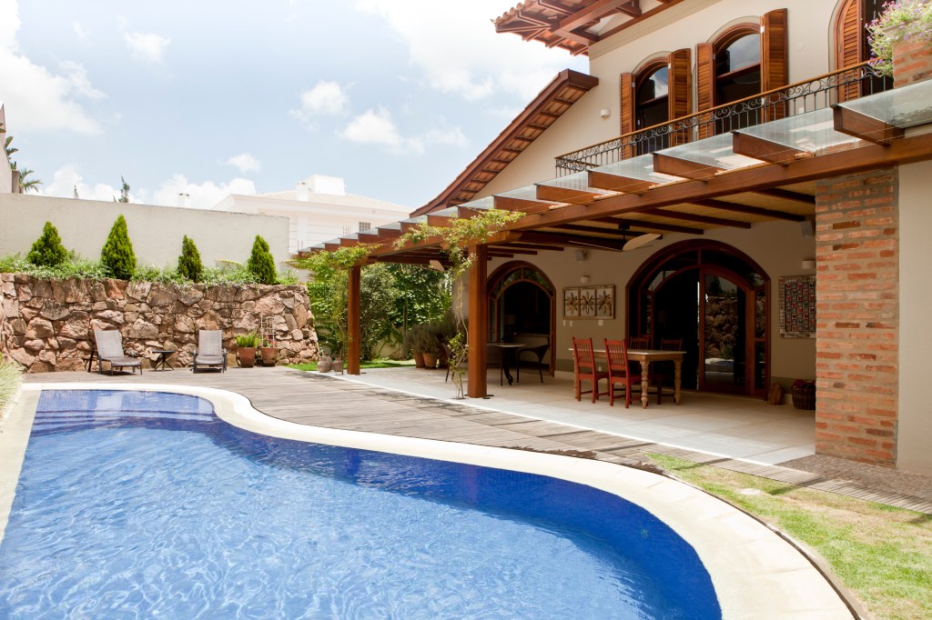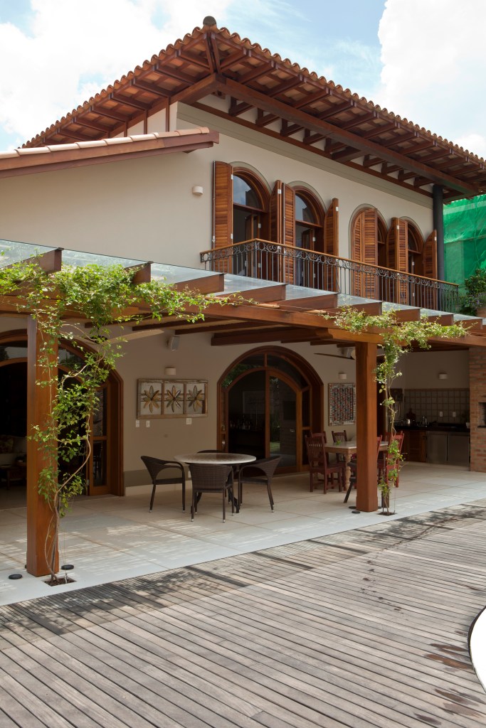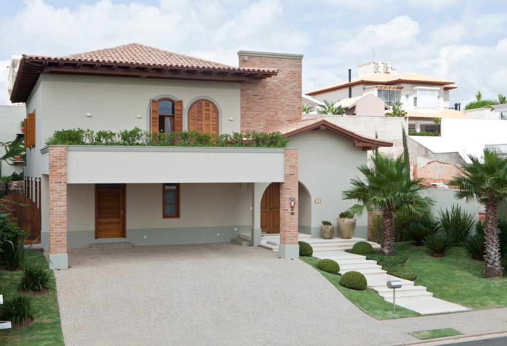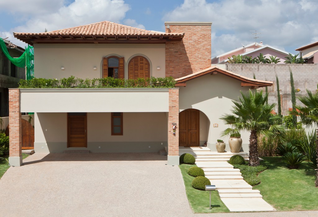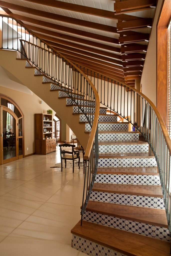 Esta residência se destaca pelo telhado aparente detalhado, que agrega charme e um toque espanhol ao design. A fachada conta com arcos elegantes, esquadrias redondas e uma jardineira sobre a garagem, trazendo harmonia e cor. No interior, a escada curva, com espelhos de ladrilhos decorativos e degraus de madeira, combina funcionalidade e estética artesanal. Ao fundo, um pergolado com estrutura trabalhada abriga a churrasqueira, com forro de bambuzinho que adiciona um toque rústico. A piscina orgânica, envolta por um muro de pedras e paisagismo exuberante, completa esse refúgio acolhedor e sofisticado.