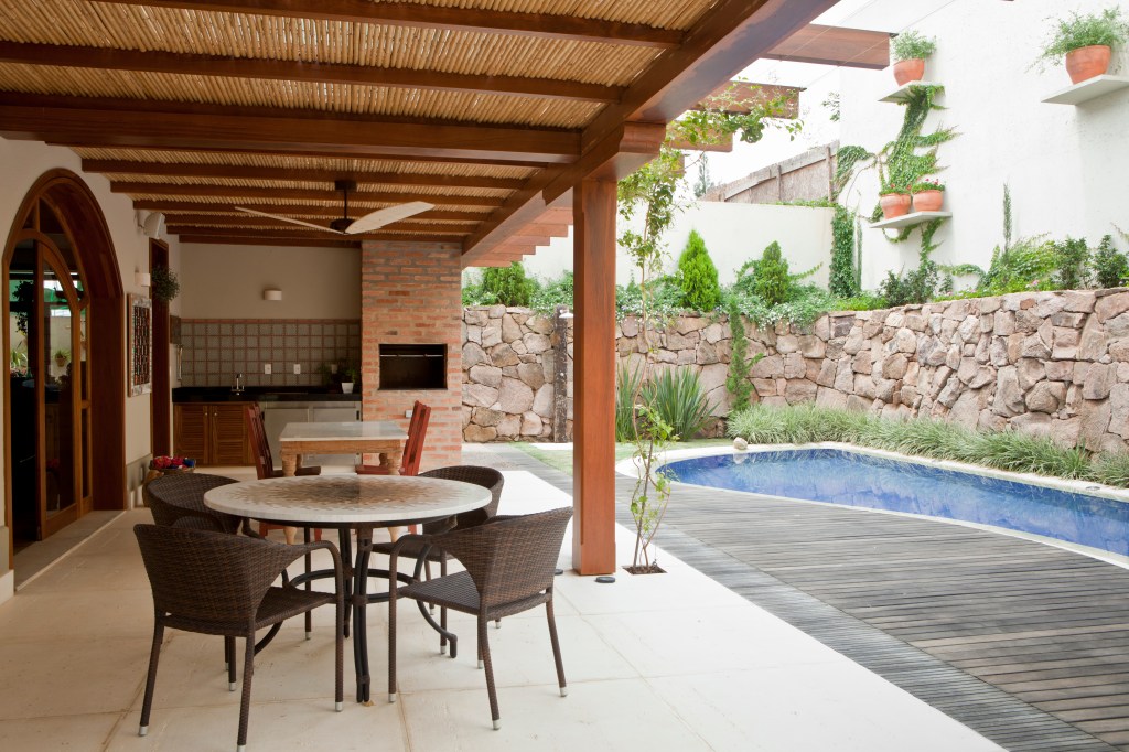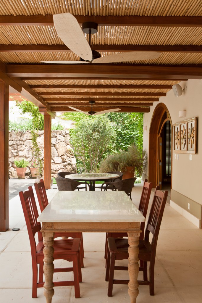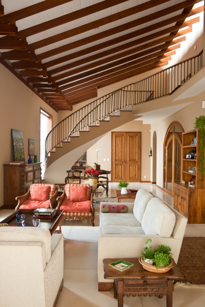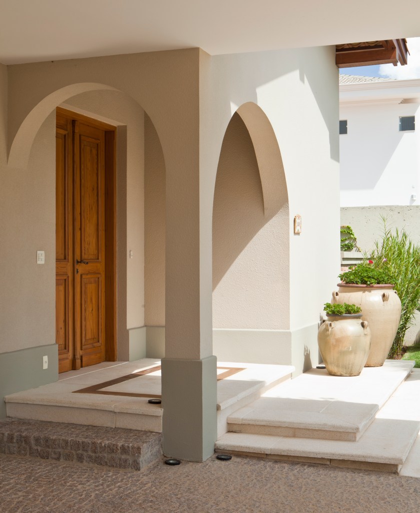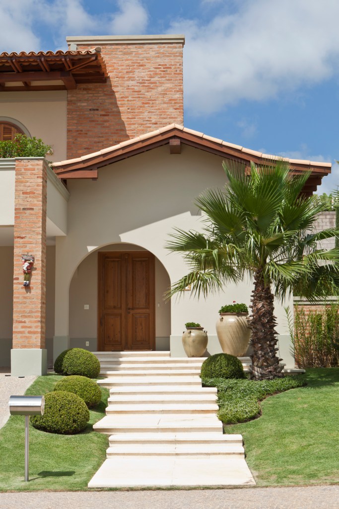Esta residência se destaca pelo telhado aparente detalhado, que agrega charme e um toque espanhol ao design. A fachada conta com arcos elegantes, esquadrias redondas e uma jardineira sobre a garagem, trazendo harmonia e cor. No interior, a escada curva, com espelhos de ladrilhos decorativos e degraus de madeira, combina funcionalidade e estética artesanal. Ao fundo, um pergolado com estrutura trabalhada abriga a churrasqueira, com forro de bambuzinho que adiciona um toque rústico. A piscina orgânica, envolta por um muro de pedras e paisagismo exuberante, completa esse refúgio acolhedor e sofisticado.