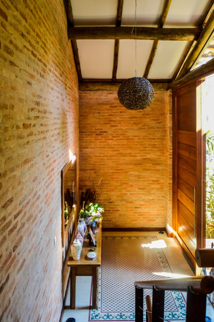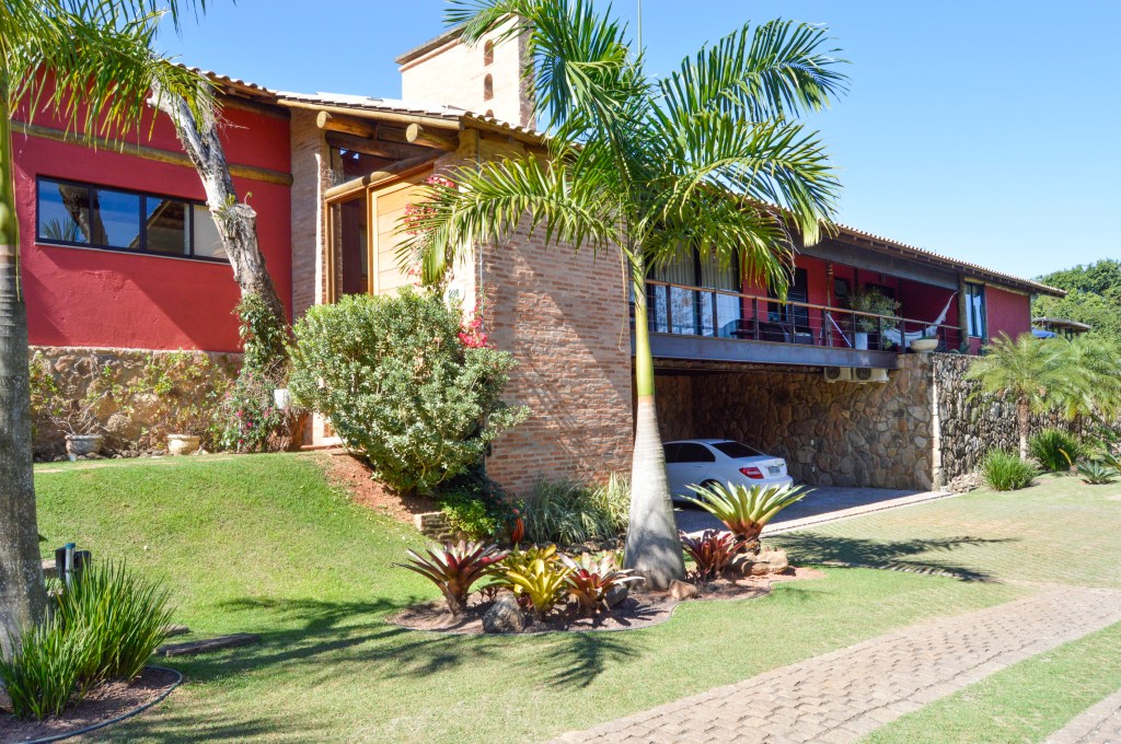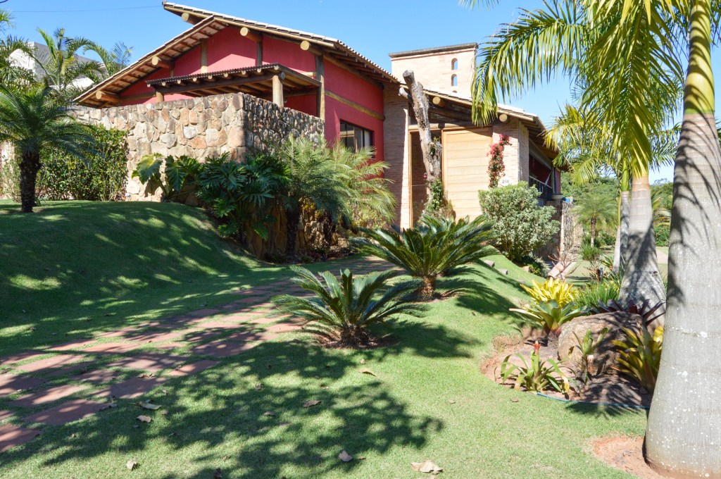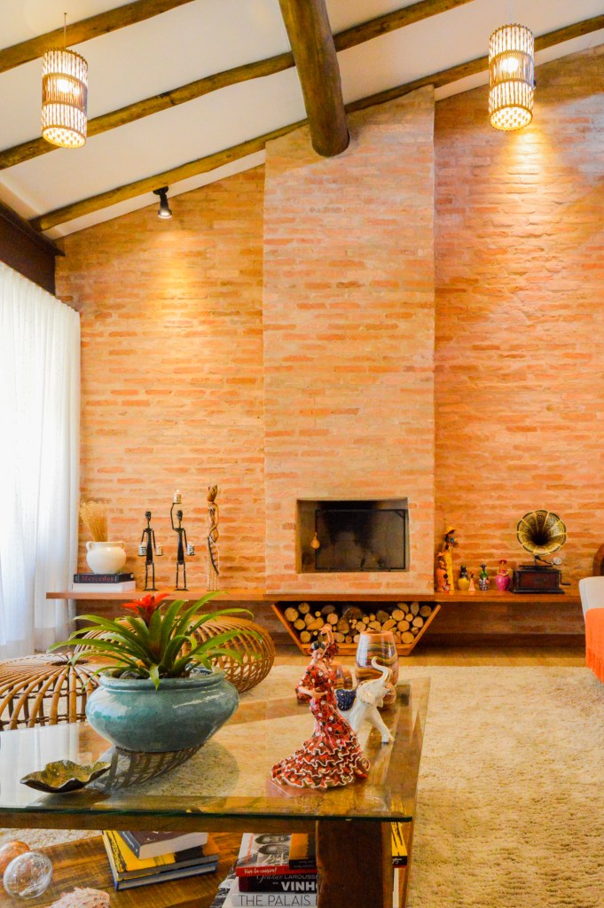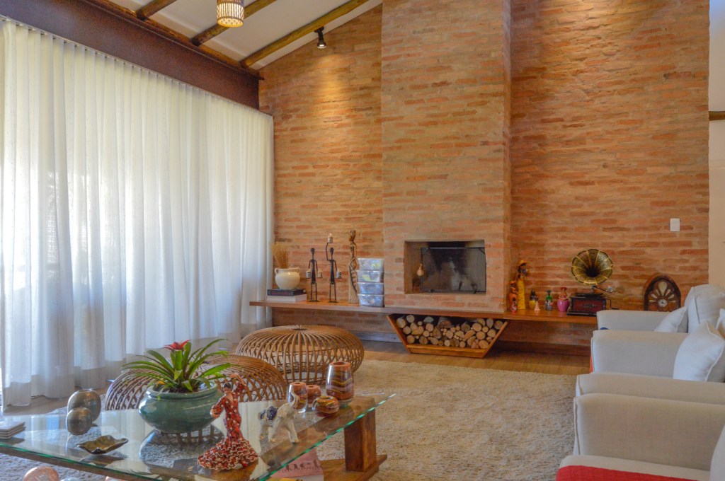 Essa residência rústica combina materiais naturais e elementos tradicionais para criar um ambiente acolhedor. Muros e garagem são revestidos com pedras Bolão, enquanto o telhado cerâmico e os tijolinhos aparentes reforçam o charme do projeto. No térreo, os espaços são organizados de forma funcional, com a garagem e a adega no nível inferior. Vigas e colunas de madeira aparente acrescentam um toque artesanal, e o paisagismo exuberante complementa a fachada. A piscina, voltada para a vegetação, e a lareira de tijolinho no interior reforçam o aconchego, tornando a casa um refúgio perfeito em meio à natureza.