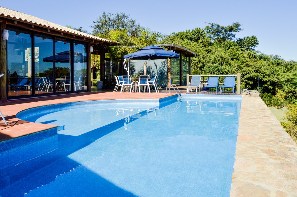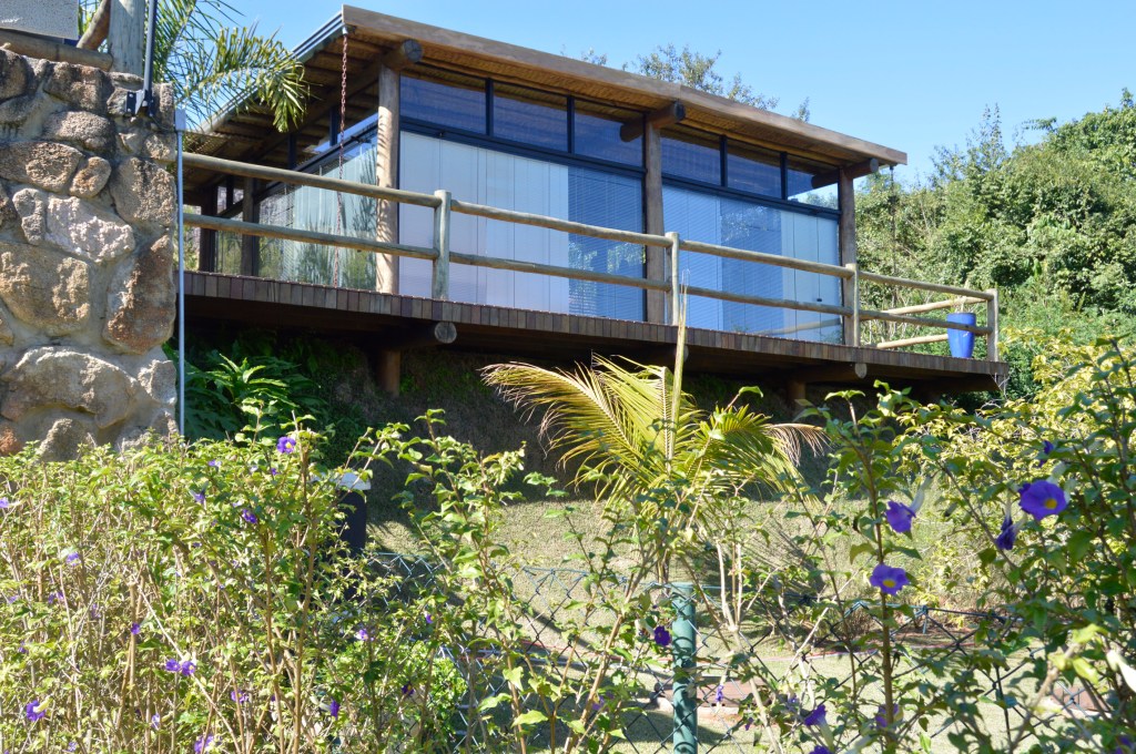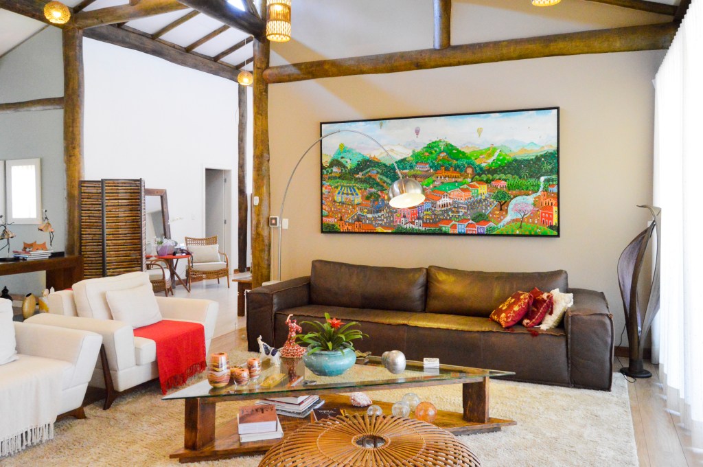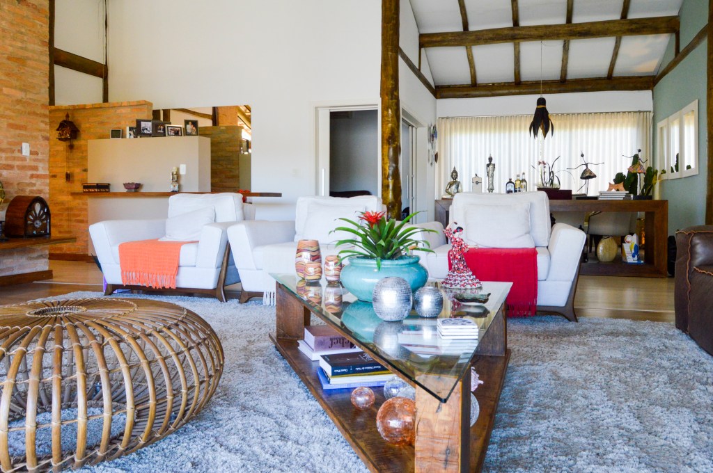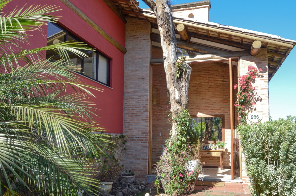 Essa residência rústica combina materiais naturais e elementos tradicionais para criar um ambiente acolhedor. Muros e garagem são revestidos com pedras Bolão, enquanto o telhado cerâmico e os tijolinhos aparentes reforçam o charme do projeto. No térreo, os espaços são organizados de forma funcional, com a garagem e a adega no nível inferior. Vigas e colunas de madeira aparente acrescentam um toque artesanal, e o paisagismo exuberante complementa a fachada. A piscina, voltada para a vegetação, e a lareira de tijolinho no interior reforçam o aconchego, tornando a casa um refúgio perfeito em meio à natureza.